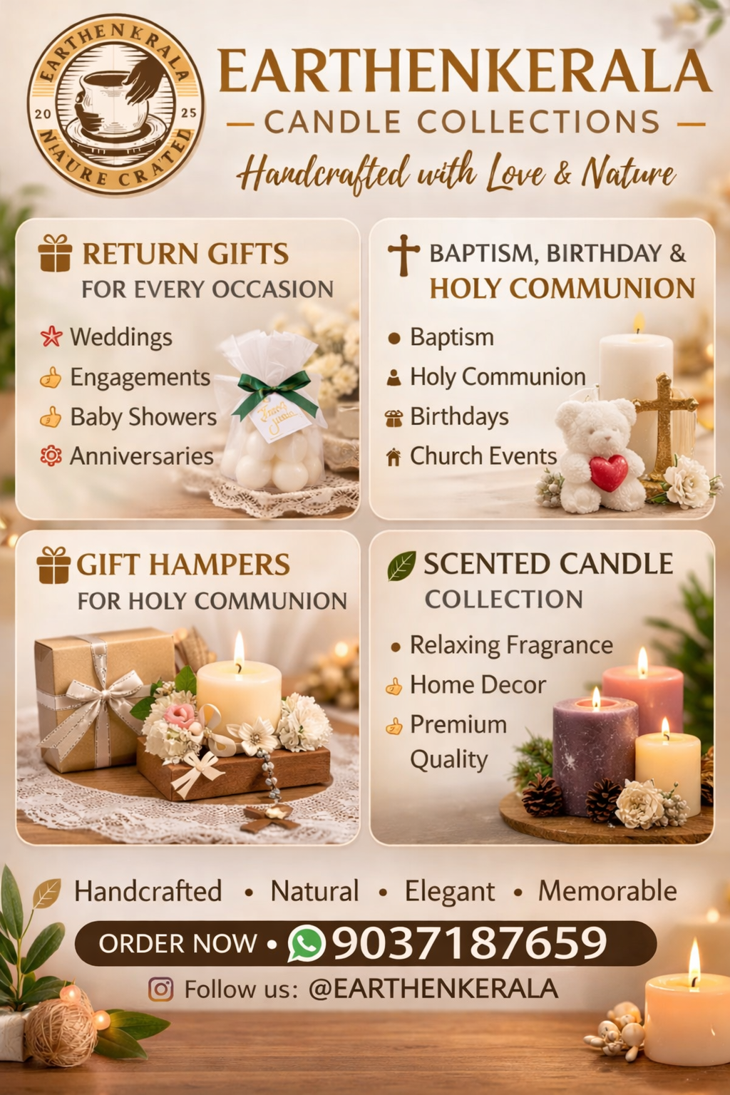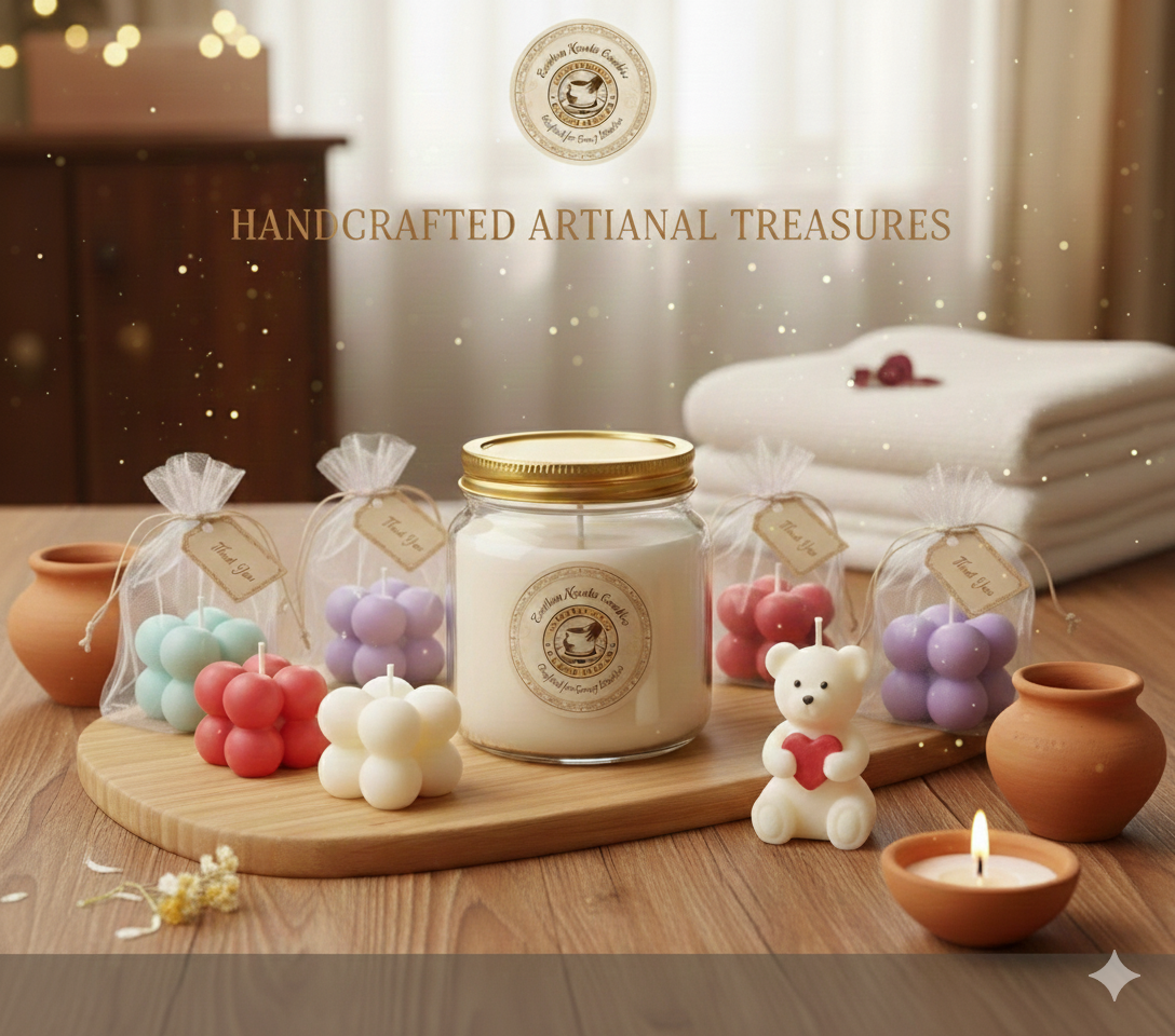 Welcome to Earthen Kerala. We specialize in handcrafted, artisanal scented candles and unique bubble candles, thoughtfully created to light up your special events. Whether you are looking for the perfect return gift for a Holy Communion, a meaningful token for a Baptism, or a charming addition to a birthday hamper, our candles offer a touch of timeless warmth. Each piece is crafted with care, making them the ideal choice for any milestone you wish to celebrate