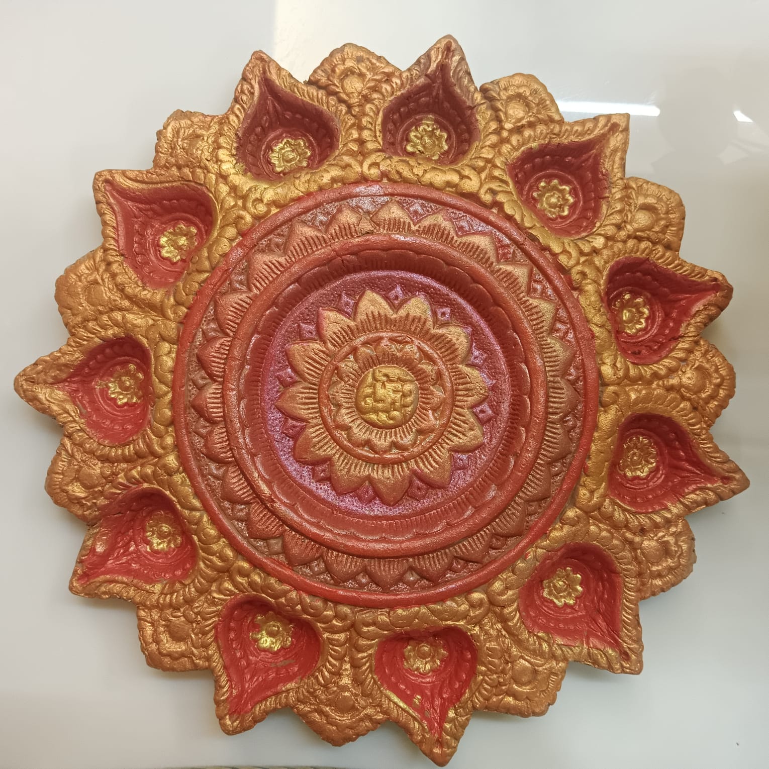 This beautiful lamp plate is designed to hold multiple diyas (oil lamps), making it a perfect centerpiece for Diwali, pujas, or any festive occasion. The rich, earthy terracotta material is hand-painted in a vibrant combination of deep Red and shimmering Gold, embodying the spirit of celebration.