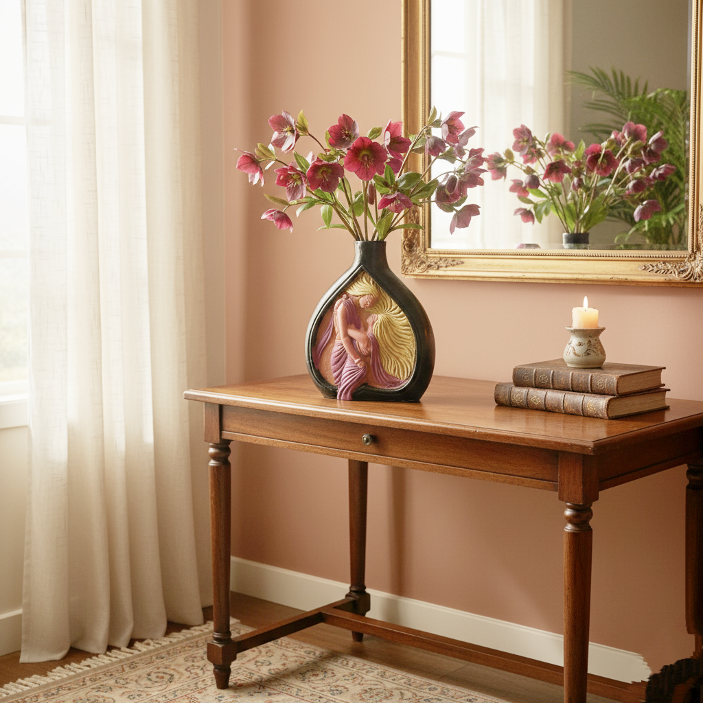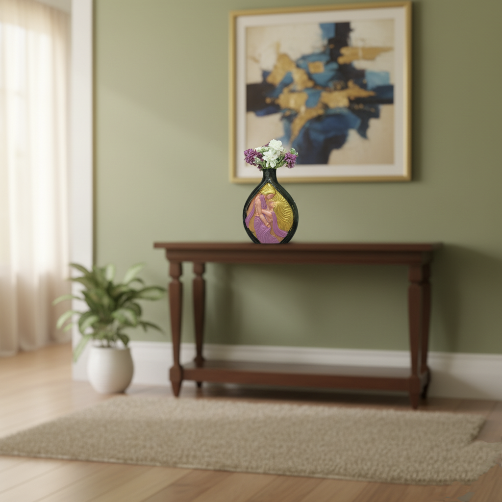 Perfect for adding a touch of traditional Kerala art and romantic flair to any living room, bedroom, or as a thoughtful gift for weddings, anniversaries, or housewarmings. It can be used as a flower vase for artificial bouquets (like the ones shown) or simply displayed as a unique sculpture.